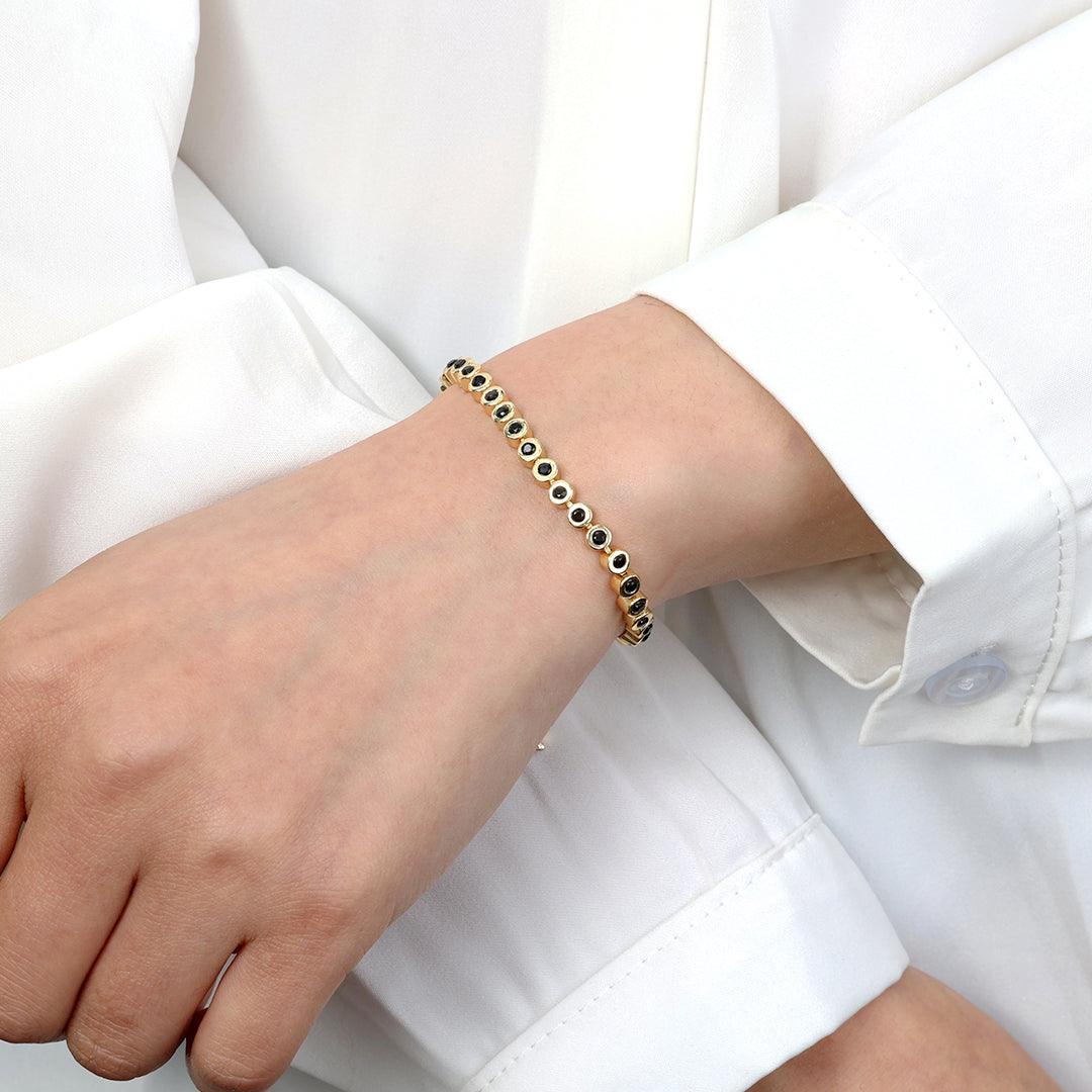 Discover the allure of the Black Gemstone Bracelet. Featuring black zircon stones set in a 14k gold-plated chain, this bracelet adds a subtle sparkle to any outfit.