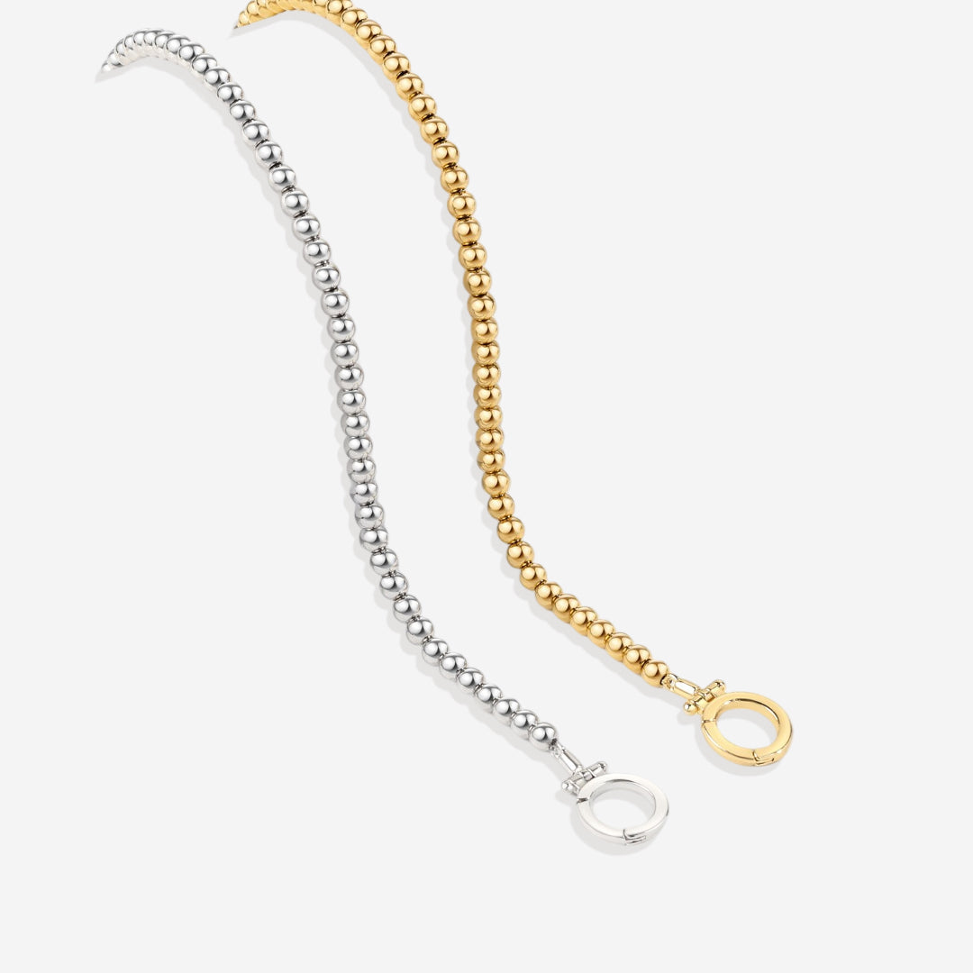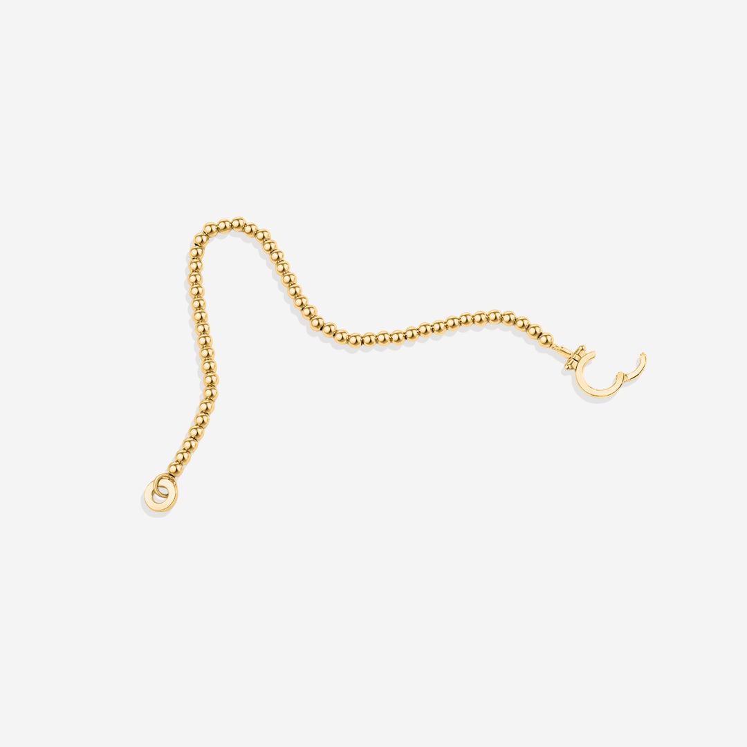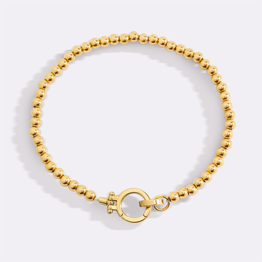 Delicate gold beads meet a mint charm clasp for a playful twist. Style it solo or personalize with charms. Effortless, versatile, and perfect for stacking—your bracelet, your way.