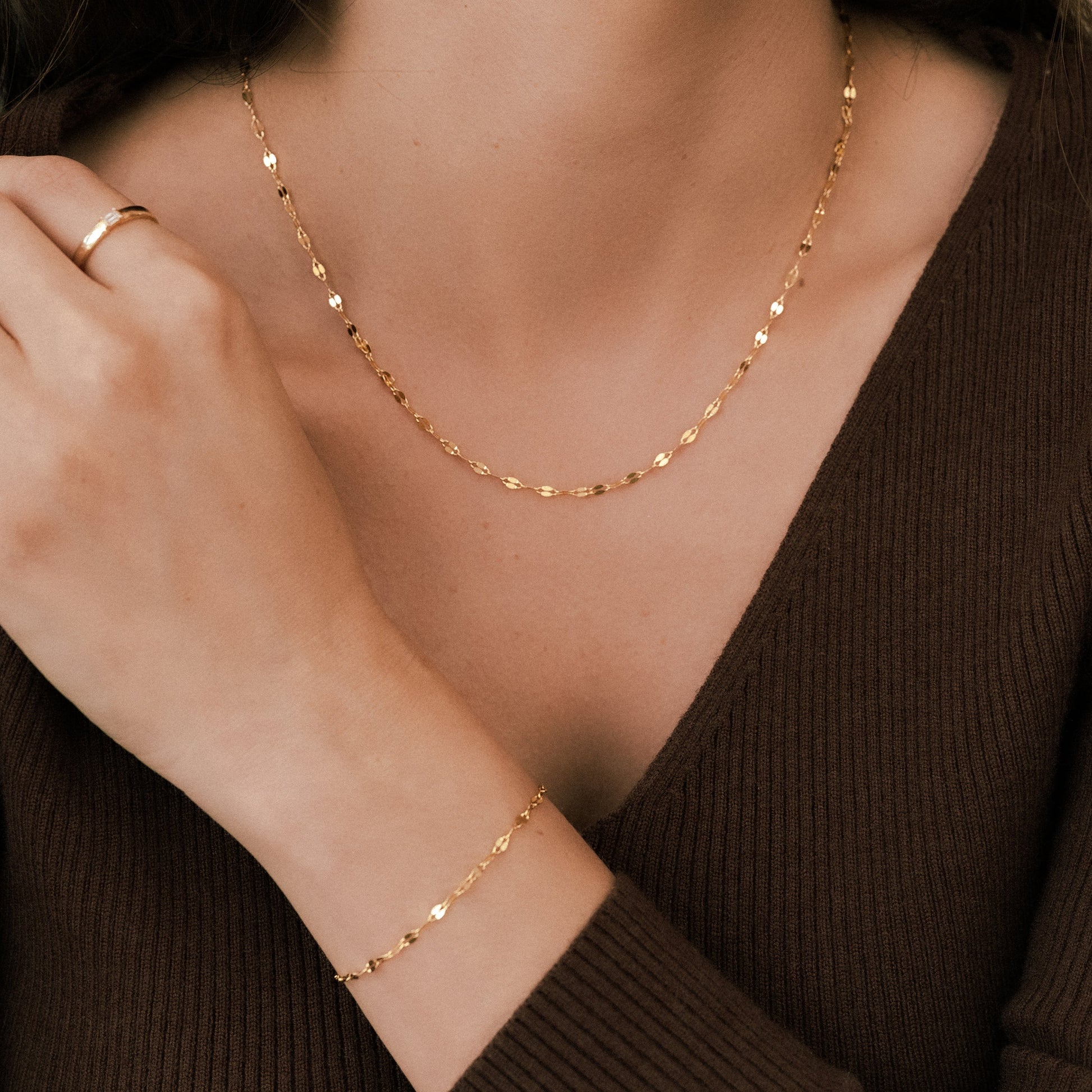 A golden shimmer that feels soft as petals—this petal chain bracelet adds a graceful finish to your look, whether you wear it solo or stacked. Its sleek links catch the light just enough to make everyday sparkle feel effortless.